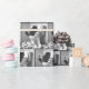 Un gato negro mullido desenreda juguetamente rollos de papel higiénico mientras se sienta en un inodoro en un baño blanco y negro de baldosas