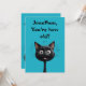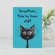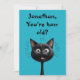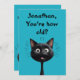 Una tarjeta de cumpleaños con una ilustración de un gato negro muy sorprendido sobre un fondo azul. Texto totalmente editable en la parte delantera y trasera. Crea tu tarjeta de cumpleaños personalizada.