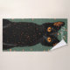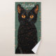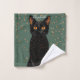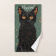 Un gato negro impactante con ojos naranjas brillantes, adornado con naranjas brillantes y espinillas verde azuladas, creando un efecto cósmico o estrellado. El diseño presenta una estética minimalista pero mística, con puntos dispersos que se asemejan a las luciérnagas o a un aura mágico, perfecto para los temas de la monotonía y el encanto.