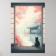 Esta apacible obra de arte captura la silueta de un gato negro que mira a un tranquilo paisaje japonés enmarcado por pantallas de shoji. El follaje otoñal vibrante, las suaves reflexiones sobre el agua y un edificio japonés tradicional crean un ambiente armonioso y tranquilo. Ideal para los amantes de la estética japonesa, el arte minimalista y la decoración inspirada en el gato.