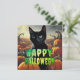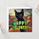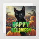 ilustracion de un gato negro de brujas en un campo de calabaza