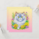 Gato persa blanco y lindo rodeado de flores amarillas y rosas acuarela botánica arte. Carta en blanco.
