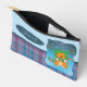 Una bolsa divertida para ayudar a tu hijo a mantener sus lapiceros y lápices organizados. Cuenta con un gato de jengibre personalizado parado en la nieve en la parte delantera y un patrón de yeso azul y púrpura en la parte trasera. Personalízalo con un nombre . © ArianeC Ilustraciones-Todos los derechos reservados