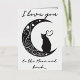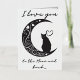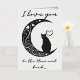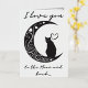 Esta encantadora carta capta la esencia del romance a través de su diseño minimalista, con una silueta elegante de un gato contemplativo encaramado sobre una luna creciente. La luna misma está adornada con delicados remolinos, corazones y estrellas, creando una atmósfera de ensueño que hace que el espectador mire un poco más. El uso de una paleta monocroma con sutiles tonos realza la silueta, lo que hace de ésta una elección elegante para un amante de la sencillez y la gracia felina. La adición de la frase "Te amo a la luna" podría hacer de este diseño una señal ideal de afecto por un ser querido, expresando sentimientos profundos con un giro cósmico. El sentimiento se entiende universalmente, pero se presenta de manera única, haciendo de esta postal una manera perfecta de transmitir el amor en ocasiones especiales o como una dulce e inesperada sorpresa. El ambiente sereno del diseño también lo hace adecuado para el encuadre, sirviendo como un recordatorio atemporal del afecto.