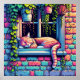 Ai arte representa a un gato somnoliento en un alféizar de ventana rodeado de plantas colgantes y paredes de ladrillo. Arte bonito para los amantes de las plantas o de los gatos.