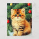 ¡Postcard con un gato navideño vintage! Un gatito naranja con rayas negras se sienta en la nieve. Detrás del gato hay un árbol de Navidad con adornos rojos y amarillos. También en la nieve hay un regalo rojo. ¡Un regalo perfecto para los amantes de la temporada de Navidades y gatos!