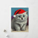 ¡Tarjeta de vacaciones con un gato Navidad usando un sombrero de Santa! Este gatito gris de ojos azules posa en un campo de nieve. ¡Un regalo adorable para los amantes de los Navidades y de los gatos!