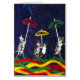 Ilustracion caprichoso de Louis Wain de gatos caminando en la lluvia llevando paraguas coloridos.