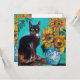 Gato negro expresivo y caprichoso, girasoles coloridos y hojas verdes en colores azul turquesa y amarillo. Pintura acrílica original artística y vibrante sobre panel de madera por Bulgan Lumini (c)