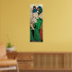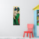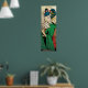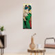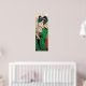 Geisha 芸 una larga poster de impresión vertical 者japonesa, con una Geisha vestida de verde con su abanico de mano, flores en la cabeza y hojas de pergamino marrones sobre fondo de color gris marrón.