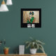 Geisha 芸 者 poster de impresión japonesa, con una Geisha vestida de verde con su abanico de mano, flores en la cabeza y hojas de desplazamiento sobre fondo moreno, en un borde negro y la palabra 芸 者.