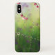 Una telaraña plateada cubierta de rocío brillante cae purpurinas a la cálida luz del sol de una fresca mañana verde de primavera. Las diminutas flores rosadas de un árbol cuelgan detrás de la web, reflejadas en las gotas.