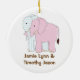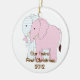 Dulce adorno navideño, con adorables gráficos de una raya azul y un elefante de un punto polka rosa sosteniendo baúles. El texto marrón de abajo dice: Nuestros gemelos primera Navidad, con el año. En la parte de atrás están los mismos elefantes coloridos con los nombres en texto marrón. Personaliza todo el texto para la primera Navidad de tus hijos.