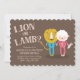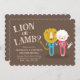 FRENTE: Un adorable león y cordero, ambos con sus pijamas estampados. El cordero se sostiene sobre una muñeca conejita. El texto "¿León o Cordero?" ya está incluido en la invitación. Simplemente personaliza el resto de la información con tus nombres y detalles del fiesta. VUELTA: El mismo dúo de critter - sólo más pequeño. Tiene la opción de agregar una línea de texto a la parte posterior de la invitación.