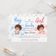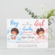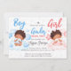 El sexo de los niños o chicas revela la invitación a la fiesta. Tradicional niño lindo rosa y azul y bebé chica sentado en una nube, abrazando el corazón con globos.