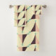 Geometric pattern with overlapping beige, peach, and brown triangles, accented by teal circles. The design forms a zigzag, creating a retro vibe.