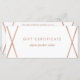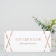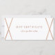 Este elegante y moderno certificado de regalo presenta un fondo blanco con un diseño geométrico falso de color oro subió. En la parte trasera hay mucho espacio para que pueda personalizares con la información de su tienda o empresa.