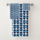 Toalla de baño de patrón geométrico del triángulo blanco azul de la Marina Azul diseñada por Nisha Prabhu. Este juego de toallas de baño presenta una sorprendente combinación de azul, azul marino y blanco en un patrón geométrico triangular. El conjunto incluye una toalla de baño, una toalla de mano y un paño de lavado, lo que lo convierte en un lugar ideal para uso individual y familiar. La geométrica vibrante aporta un toque moderno y elegante a cualquier decoración del cuarto de baño. Con este juego de toallas de baño de patrón geométrico del triángulo blanco azul de la Marina azul, el cuarto de baño es moderno y de diseño.