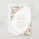 diseño geométrico floral con flores pintadas a mano de color rosa y marco geométrico de oro. El color y los detalles del texto se pueden personalizar.