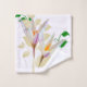 El conjunto de toallas de baño presenta delicados elementos florales tipo croco enmarcados por venas beige y viñas verdes, con hojas blancas translúcidas que añaden profundidad y textura a un fondo de líneas concéntricas y cuadradas, creando un elegante contraste.