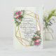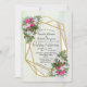 Purpurina de oro geométrico sobre papel textil con lirios blancos, helechos y flores rosadas rojizas de Amaryllis para un boda de primavera o verano