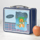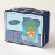 Cute kid metal lunch box with a cartoon ginger cat wearing a hat and a scarf on a snowy day , as well as some blue and purple plaid . Personalize it with the child's name .