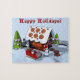 Rompecabezas con el ilustracion de una casa de jengibre, galletas, caramelos y muñecos de nieve.