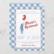 Una clásica invitación de gingham azul y rojo superior, con un patrón de gingham azul en la parte trasera.