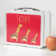 Estupenda caja de almuerzo para la escuela, este diseño presenta un fondo rojo con jirafas acuarelas. Personaliza con un nombre.