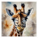Una jirafa con una acuarela detallada y ojos expresivos se representa sobre un fondo suave y borroso. Los colores naturales realzan el aspecto realista.