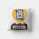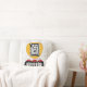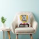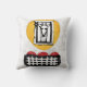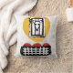 Una jirafa fina a rayas que se dibuja sobre una forma circular amarilla. Debajo de la jirafa se encuentra una pieza final negra con un patrón cruzado blanco y un guarnecido de vieira rojo.