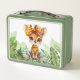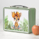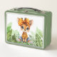 Giraffe with big puppy dog eyes wearing a polka dot bow and knitted jumper with lush green foliage