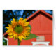 Un girasol se opone al contexto de un granero rojo con una bandera americana. El girasol (helianthus annuus) es un natural anual de la planta a las Américas. El girasol es la flor de estado de Kansas. En la parte de atrás de la tarjeta, una abeja visita un girasol. Las abejas son donadoras de polen importantes.