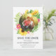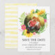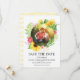 Una bella corona de girasol con brotes de flores de acento rosado y marcos verdes te ahorran la foto de la cita. Añade tus detalles y tu foto. La parte trasera de la tarjeta está decorada con franjas acuáticas de color amarillo pálido.