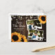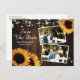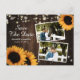 Estas bodas florales salvan las tarjetas postales con fotos de dátiles con girasoles en la barcaza y corredor de encaje sobre un fondo de madera de granero son ideales para una fiesta de boda de temática rústica inspirada en los girasoles. Elementos coincidentes disponibles.