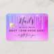 Un certificado de regalo a la moda para tarjetas de crédito. Ideal para profesionales de la belleza, maquilladores, estilistas de cabello, técnicos de uñas, tiendas en línea de spa cosmético y más. Este diseño deslumbrante presenta goteos de diamantes sobre un fondo morado. Tenga en cuenta que se simulan elementos purpurinas, espumosos y holográficos.
