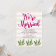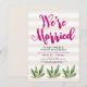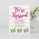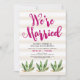 Esta elegante y divertida invitación de recepción después de la boda cuenta con ilustraciones de cactus, con tipografía rosa oscuro sobre un fondo a rayas neutro, para un aspecto desértico glamoroso. Arte a rayas de Indie Grace Designs.