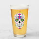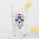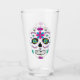 Este vaso tiene un diseño colorido, tradicional, del cráneo de azúcar mexicano.