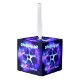 Una imagen fractal púrpura y azul de una estrella de cinco puntas en un remolino de color circundante; todo sobre un fondo oscuro. El texto islandés que dice "Gleðileg jól" (Feliz Navidad) aparece en azul brillante y blanco. Añade tu propio texto adicional.