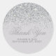 Glamoroso Purpurina de plata moderna gracias pegatinas. Una plata hermosa y sofisticada con acentos purpurinas. Este diseño de boda purpurina forma parte de nuestra Colección de Bodas Purpurinas en Metro-Events en Zazzle. También se dispone de suministros adicionales de boda de coordinación. Para los colores y diseños personalizados, póngase en contacto con Metro-Event.com Por favor vea su diseño en los límites y/o en la vista de cuadrícula antes de colocar su pedido ya que cualquier texto que se extienda más allá de las líneas de límite rojo no se imprimirá en su invitación. Si el texto no se ajusta a las líneas de límite, intente reducir el tamaño del texto y/o de la invitación para que todo el texto se ajuste a las líneas de límite.