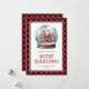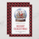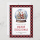 Tarjeta de Navidades de mantas de búfalo rojo personalizado con un globo de nieve con Santa Claus y reno. Personalice fácilmente esta tarjeta de Navidades rojos acuarela con su nombre familiar y el año.