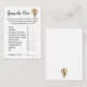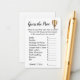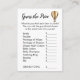 Usando un tipo de letra de guión moderno, el encabezado dice "Adivina el precio". Debajo están las instrucciones para el juego, seguidas de una lista de productos para bebés a la que se debe añadir una línea de precios. El texto del cuerpo se representa en un tipo de letra sans-serif informal y moderno. Todo el texto se colocó sobre un fondo blanco simple que puede cambiar a cualquier color que desee. Tanto en la parte superior como en la parte inferior de la parte posterior hay una única imagen gráfica que representa un globo de aire caliente de oro falso y liso, que añade un ambiente festivo y es apto para una ducha de género neutro. // Diseñado por Melody Watson para la Muserie de Papel.