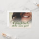 ¡Glücklich steht Dir gut! Kompliment Karte mit lachendem Frauengesicht und handschriftlichen Grüßen auf der Vorderseite der Karte. Restliche Flächen stehen zur freien Verfügung.