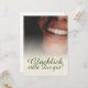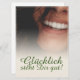 ¡Glücklich steht Dir gut! Kompliment Karte mit lachendem Frauengesicht und handschriftlichen Grüßen auf der Vorderseite der Karte. Restliche Flächen stehen zur freien Verfügung.