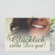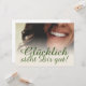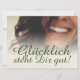 ¡Glücklich steht Dir gut! Kompliment Karte mit lachendem Frauengesicht und handschriftlichen Grüßen auf der Vorderseite der Karte. Restliche Flächen stehen zur freien Verfügung.