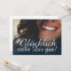 ¡Glücklich steht Dir gut! Kompliment Karte mit lachendem Frauengesicht und handschriftlichen Grüßen auf der Vorderseite der Karte. Restliche Flächen stehen zur freien Verfügung.