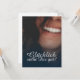 ¡Glücklich steht Dir gut! Kompliment Karte mit lachendem Frauengesicht und handschriftlichen Grüßen auf der Vorderseite der Karte. Restliche Flächen stehen zur freien Verfügung.