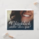 ¡Glücklich steht Dir gut! Kompliment Karte mit lachendem Frauengesicht und handschriftlichen Grüßen auf der Vorderseite der Karte. Restliche Flächen stehen zur freien Verfügung.