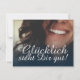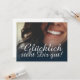 ¡Glücklich steht Dir gut! Kompliment Karte mit lachendem Frauengesicht und handschriftlichen Grüßen auf der Vorderseite der Karte. Restliche Flächen stehen zur freien Verfügung.