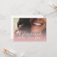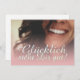 ¡Glücklich steht Dir gut! Kompliment Karte mit lachendem Frauengesicht und handschriftlichen Grüßen auf der Vorderseite der Karte. Restliche Flächen stehen zur freien Verfügung.